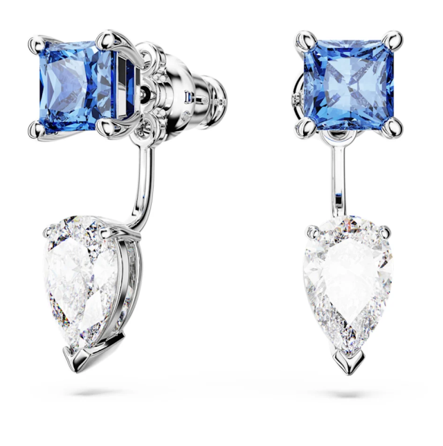 スワロフスキー 『Mesmera イヤージャケットピアス』です。プロングセットされたペアカットとスクエアカットのSwarovskiジルコニアが特徴です。ブルーのスタッドピアスのみでも着用でき、取り外し可能なペアカットドロップは、スタイルに合わせて高さを調整できます。