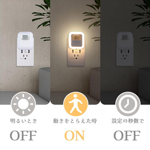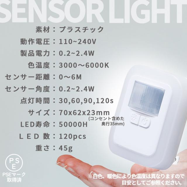 センサーライト フットライト 人感 コンセント式 室内 明るさ調節 点灯時間設定 足元灯 省エネ フットライト 電球色 暖色 白色 照明 モーションセンサー 人感センサー 暗闇センサー コンパクト 寝室 玄関 子供部屋 リビング PSE取得済