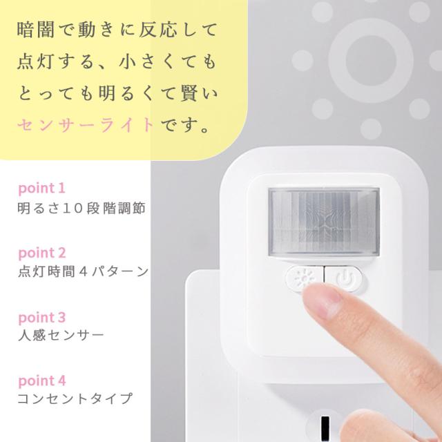 【自動点灯のコンパクトセンサーライト】暗闇で動きに反応して点灯する、小さくてもとっても明るくて賢いセンサーライトです。明るさ10段階調節、点灯時間4パターン、人感センサー、コンセントタイプ、といった小さいながらほしい機能が詰まっています。コンセント式で、充電の手間や、電池交換要らず。
