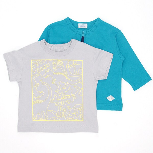 シンプルで使いやすいカーディガンとユニークな恐竜達をパネルプリントを施したTシャツとのセットアイテム。