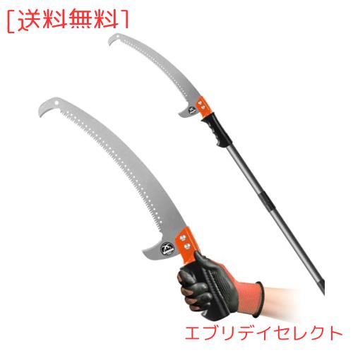 【安全保証と耐久性のある素材】:ポールは高品質のスチールで作られ、パウダーコートが施されています。また、ノコギリの刃は錆びにくいMn鋼で作られています。滑り止めハンドルグリップは快適で安全です。このポールソーは、梯子に登ることなく、高い位置の枝や葉を剪定するのに十分な強度があります。ハンドルの追加補強ネジにより、ソーヘッドがポールに十分に締まり、落下による危険がありません。