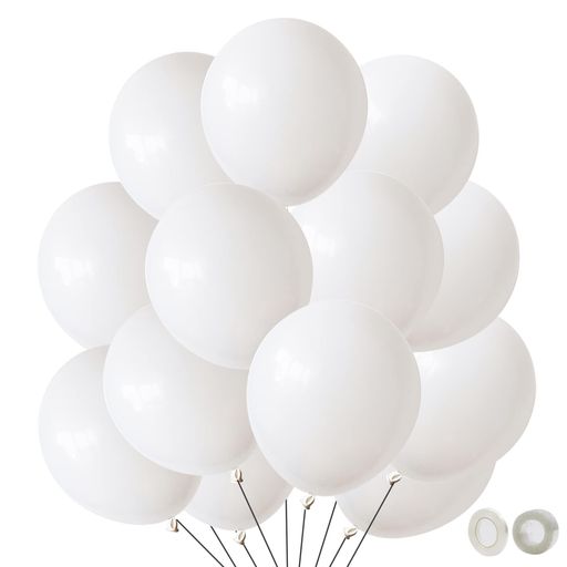 風船カラー:ホワイト(スタンダードカラー)。内容物:50個入り(粘着シール1枚、リボン1本、バルーンチェーン1本付き)。サイズ:10インチ(25cm)。ヘリウムガスや空気を入れて使用できます。ご注意:風船表面には、膨らませやすくするための微量の粉が付いています。使用前に軽く払い落としても問題ありません