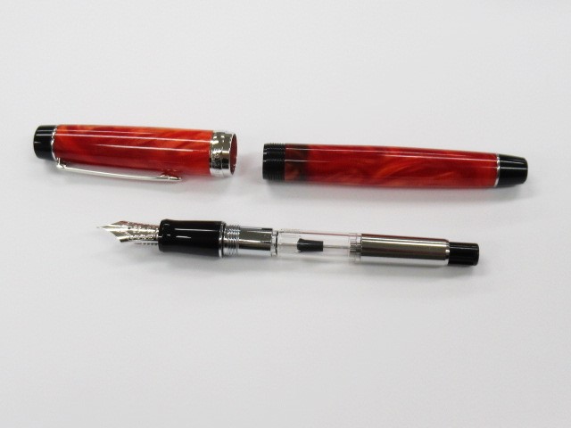 美しいマーブル模様の万年筆、樹脂軸は色褪せる事なく輝きを保ちます。