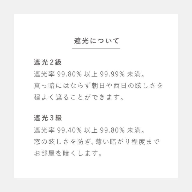 遮光率99.80%以上99.99%未満。真っ暗にはならず、朝日や西日のまぶしさを程よく遮ることができます。寝室に取り付けると、朝日をやんわりと浴びて自然な光で気持ちよく目覚めることができます。紫外線をブロックし、肌やフローリング、家具を日焼けから守ります。外からの気になる視線を遮断しプライバシーを守ります。