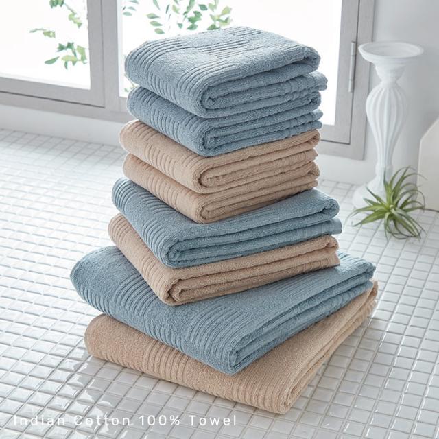インド綿を使用した丈夫なジャガード織のバスタオル。縫製部分は洗濯してもほつれにくく丈夫な二重縫製。パイル糸の上げ下げによって幾何学柄を立体的に表現しています。