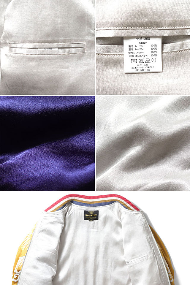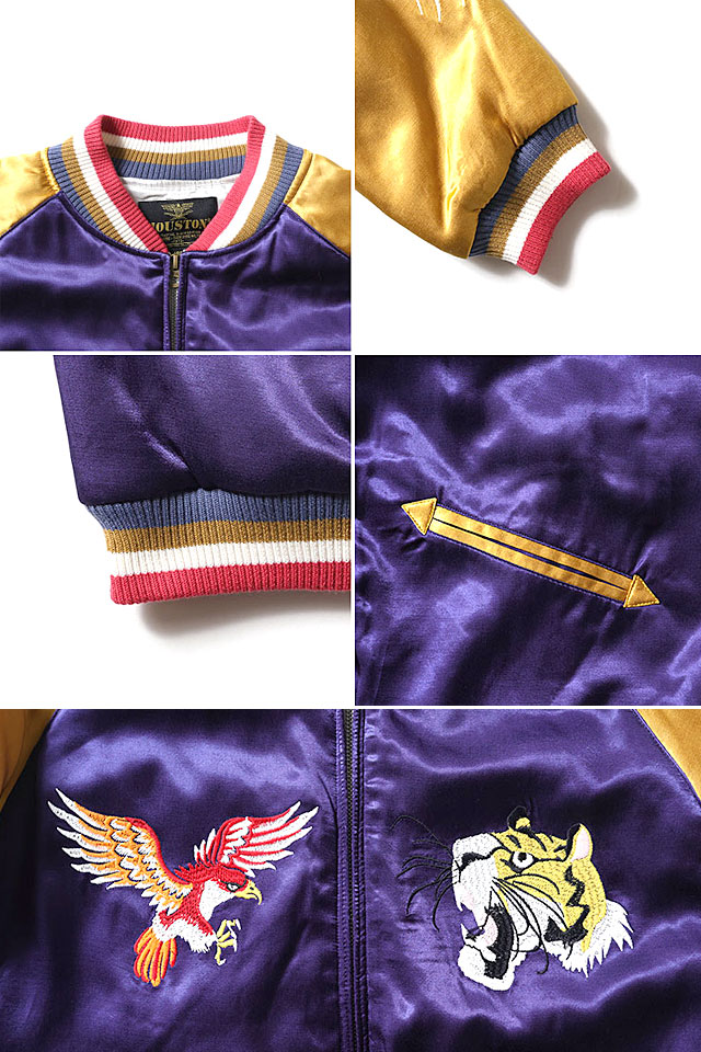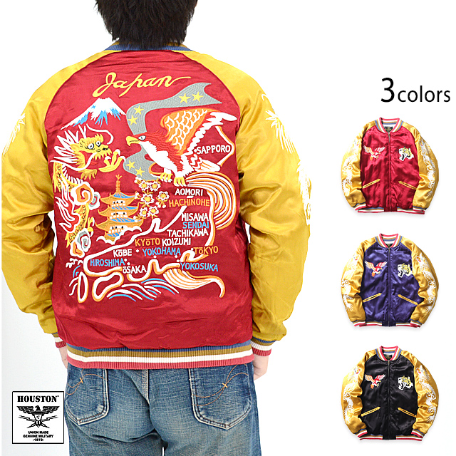 日本で初めてオリジナルのフライトジャケットを生み出し、その後も数々の国内製ミリタリー商品を製造する「ヒューストン」から、レーヨンスカジャン「MAP」(51360)のご紹介です。 オーソドックスな鷹と虎、龍を一着で入れ込んだ、ド定番のスカジャンです。 袖部分にはゴールドカラーの生地を使用し、龍の刺繍を施しました。 ボディーには表裏共にレーヨンサテン生地を採用し、着用時の肌触りも絶妙です。 1枚持っているだけでずっと使えるスカジャン。 | ||||||||||||||||||||