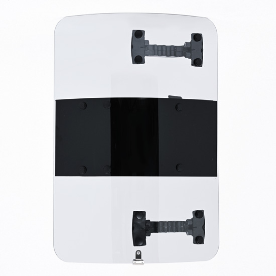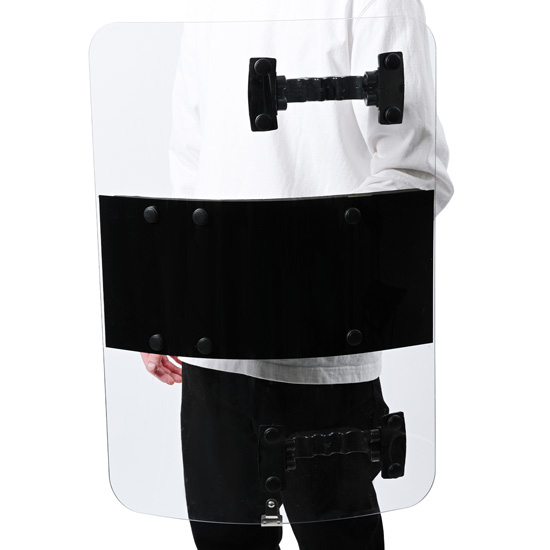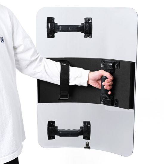 MG700Lはアーマージャパンのオリジナル商品です。4mm厚のポリカーボネートシールドは金属バット・刃物・火炎瓶に対しても十分な強度を備えています。学校や公共施設などに備えて置けば不意の侵入者に対しても複数枚のシールドで取り囲み取り押さえる事も可能です。
