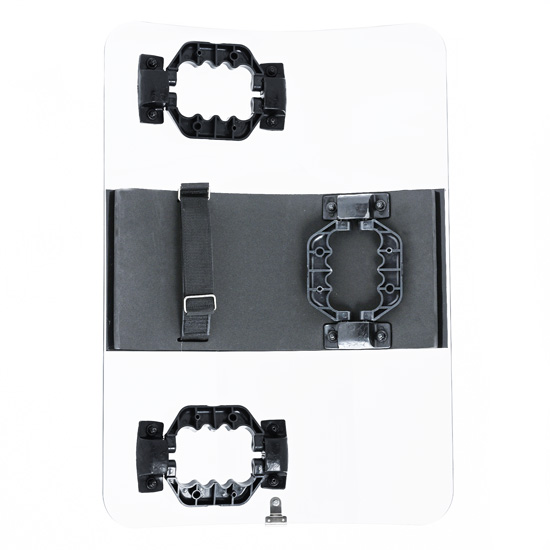 新しい4点支持の開閉型グリップは使用しない時は広げた状態でキャリングケースに入れて収納することで盾の幅が縮小しますので、複数台の収納時でも嵩張りません。また以前の2点支持と違って4点支持のグリップはホールド時の安定性がさらに良くなります。