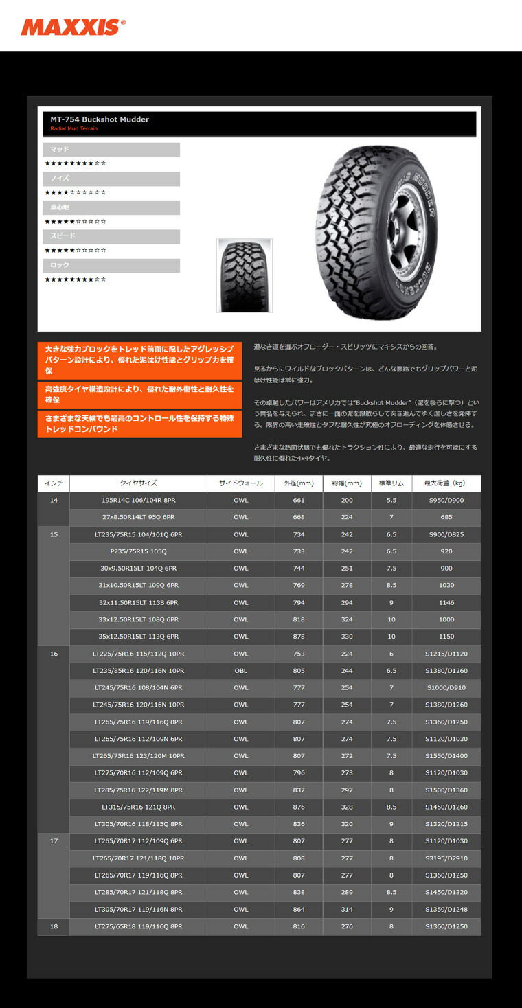 タイヤメーカー マキシス バックショットマッダーMT754 OWL
