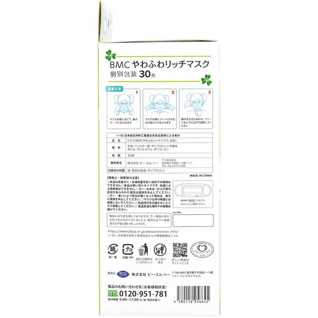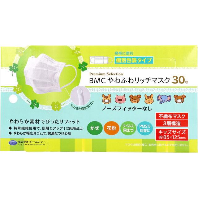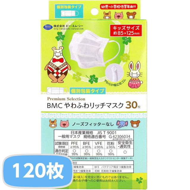 マスク 不織布マスク 子供用 BMC やわふわリッチマスク 幼児・小学校低学年向け 個別包装タイプ キッズサイズ 4箱 合計120枚