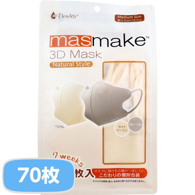 マスク 立体マスク 不織布 デュウエアー 3D ミディアムサイズ ライトベージュ・グレージュ 5袋 70枚入