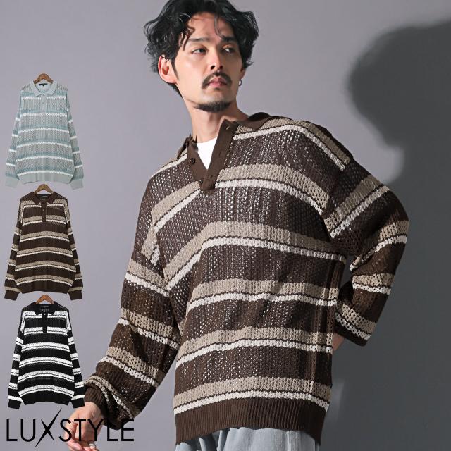 メンズポロシャツ ポロシャツ メンズ 長袖 ニット メッシュ ボーダー 総柄 透け感 春 秋【メッシュボーダーニットポロシャツ】 aa-2931