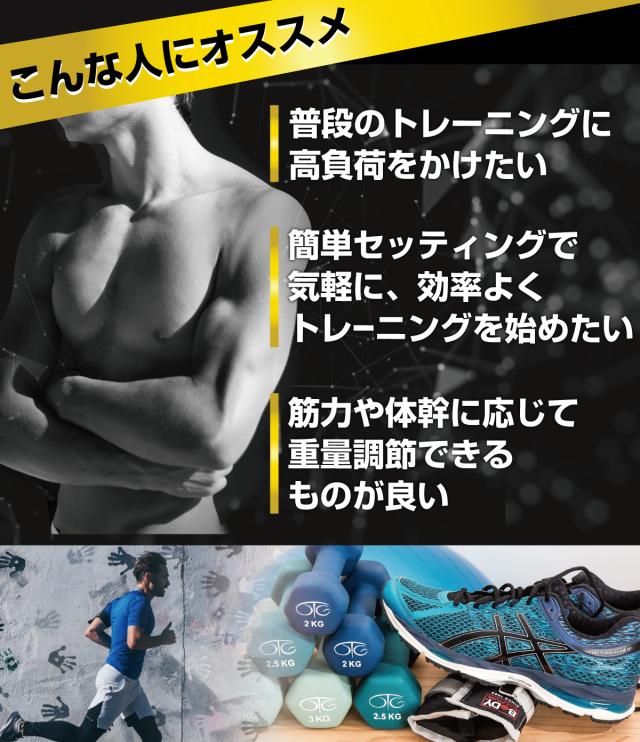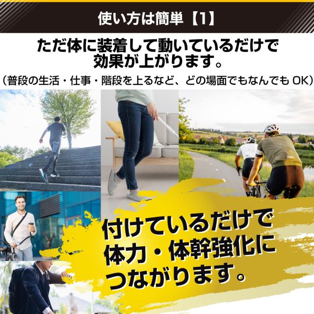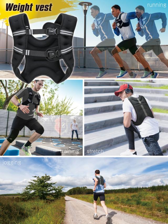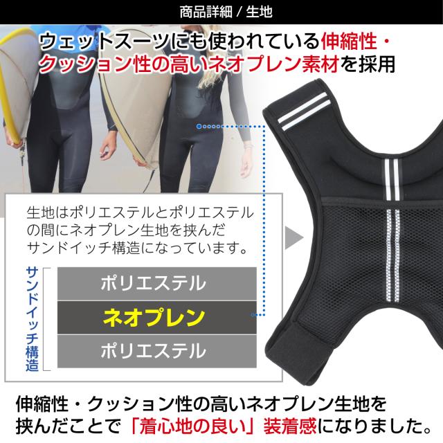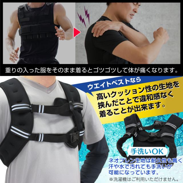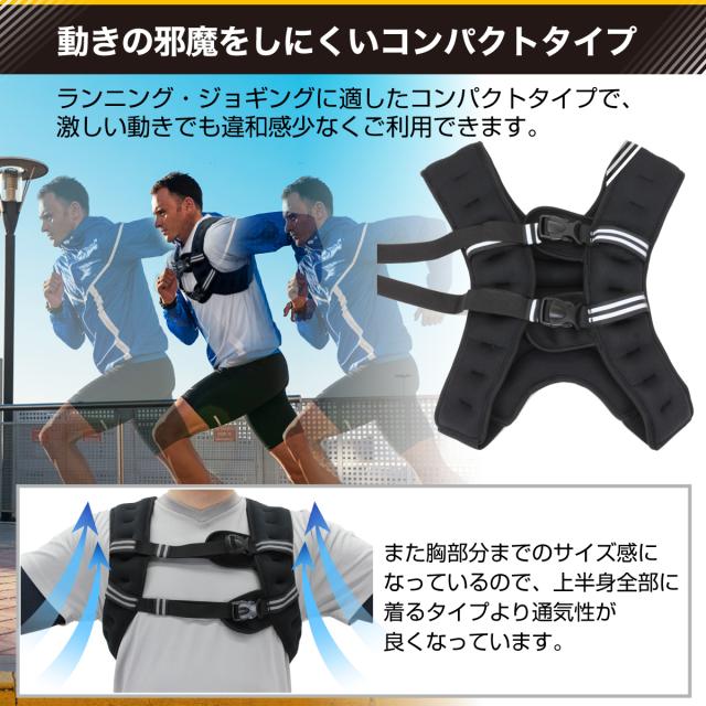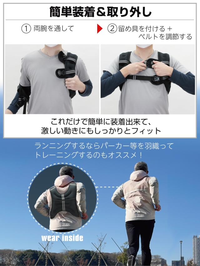 【着脱が簡単で使いやすい】両腕を通してベルトで調節をするだけの簡単装着!ボディへのフィット感と安定感を重視したデザインなので、ランニングやウォーキングに適した動きやすさ抜群のウエイトベストになります。また、ポケットとリフレクターがついているので外でも安心してご使用になれます。