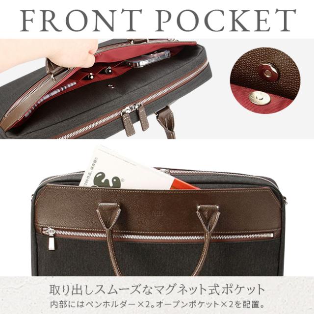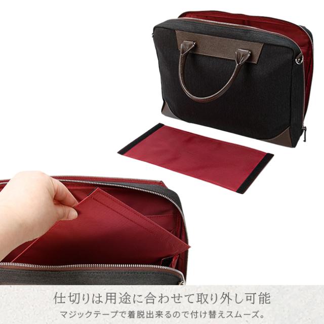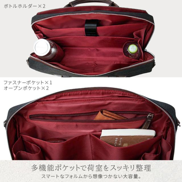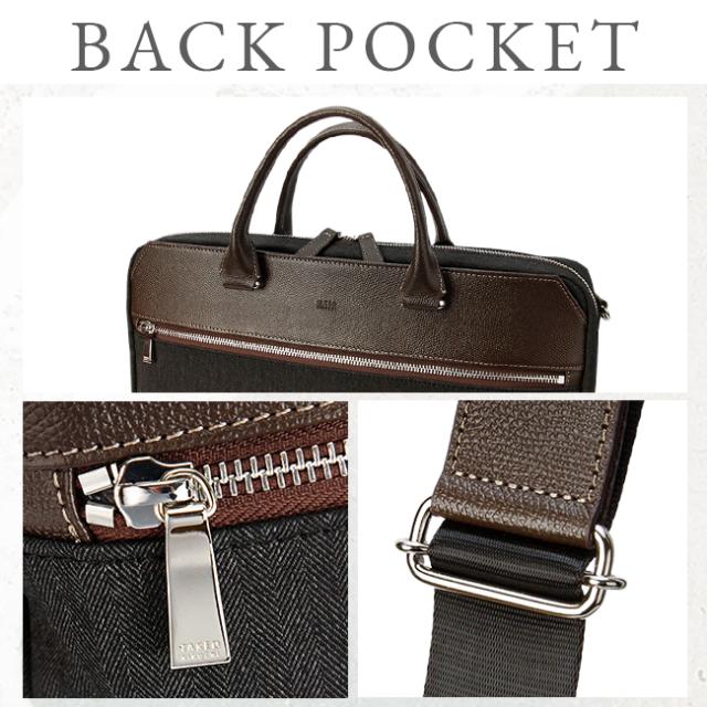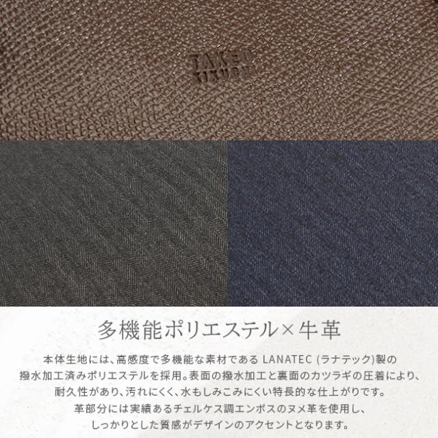 | 上品な雰囲気を纏った、TAKEO KIKUCHI らしい大人のための B4 サイズビジネスカジュアルバッグ。 撥水加工が施された高感度かつ多機能な LANATEC ラナテック製ポリエステル素材を使用し、エンボス加工の施されたヌメ革を使いデザインにアクセントを添えています。メインルームは13.3インチの PC やペットボトルを収納可能で、小物ポケットも充実しています。シーンに合わせてショルダーベルトを使い分けてお楽しみいただけます。 |