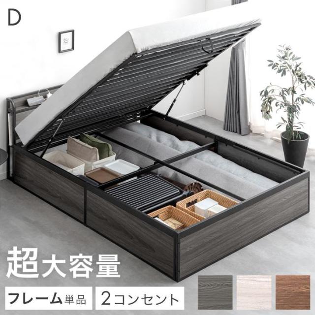 跳ね上げ収納ベッド ダブル 大容量 2コンセント 宮棚 収納ベッド ガス圧 跳ね上げ ベッド 跳ね上げ式ベッド スチールベッド リフトアップベッド 収納付きベッド ベッドフレーム 宮 棚 収納 収納付き スチール おしゃれ