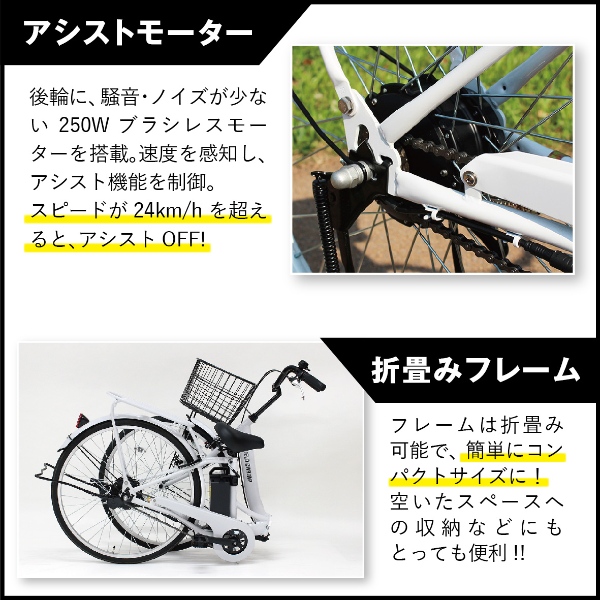 ■サイズ 26インチタイヤ (組立時)約W185×D59×H112cm (折畳時)約W133×D59×H95cm ■サドル地上高さ 約76〜88cm ■商品重量 約25kg ■材質 スチールフレーム ■仕様 アシスト機能・シングルギア・ 折畳みフレーム・カゴ・リアキャリア・バッテリー連動電源スイッチ・LEDライト(バッテリー電源連動)・サークルキー(本体/バッテリー共通キー) ■バッテリー リチウムイオンバッテリー(容量:5.8Ah) 重量:約1.24kg ■モーター ブラシレスモーター(定格出力:250W) ■充電器 電源:AC100V〜240V 充電時間:約3時間30分(PSEマーク) ■走行距離 最大約35km(充電1回分/シングルモード) ※走行距離は、走行条件によって変化します ■付属 バッテリー充電器(スペアキー付) ※お届けの車体は100%完成車ではございません。一部お客様サイドでの簡単な組立がございます。 ※組み立て後に不良の連絡をされても対応ができませんので、組み立て前にパーツに不良・傷等がないか確認を必ずしてくださいますようよろしくお願い申し上げます。 ※記載は商品仕様の一部です。仕様説明不足等の理由での返品はできません。特に適合等は必ずご確認ください。
