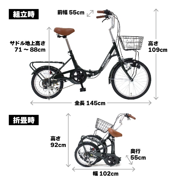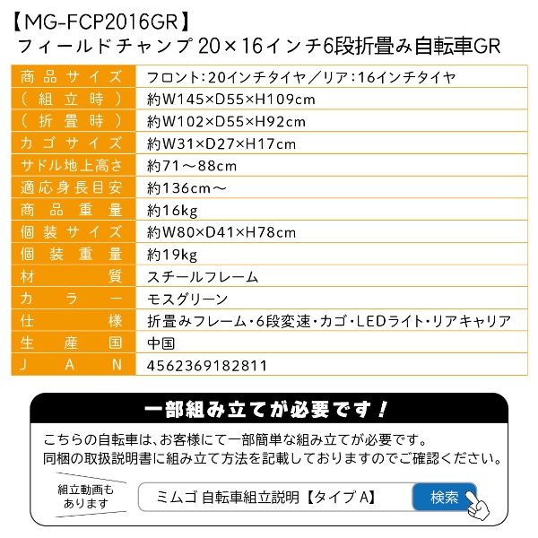 ■商品サイズ フロント:20インチタイヤ/リア:16インチタイヤ (組立時)約W145×D55×H109cm (折畳時)約W102×D55×H92cm ■カゴサイズ 約W31×D27×H17cm ■サドル地上高さ 約71〜88cm ■適応身長目安 約136cm〜 ■商品重量 16kg ■個装サイズ 約W80×D41×H78cm ■個装重量 約19kg ■材質 スチールフレーム ■カラー モスグリーン ■仕様 折畳みフレーム・6段変速・カゴ・LEDライト・リアキャリア ■生産国 中国 ※お届けの車体は100%完成車ではございません。一部お客様サイドでの簡単な組立がございます。 ※組み立て後に不良の連絡をされても対応ができませんので、組み立て前にパーツに不良・傷等がないか確認を必ずしてくださいますようよろしくお願い申し上げます。 ※記載は商品仕様の一部です。仕様説明不足等の理由での返品はできません。特に適合等は必ずご確認ください。