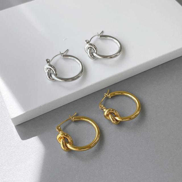 リボンを結んだようなデザイン性のあるステンレス製ノットサークルピアス。