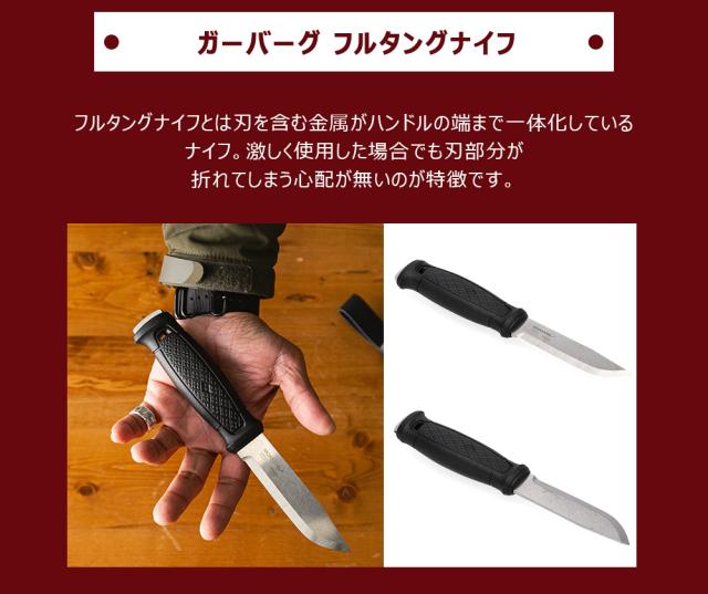 シース部分に刃研ぎ機とファイヤースターターが取り付け可能な、フルタングナイフです。フルタングナイフとは刃を含む金属がハンドルの端まで一体化しているナイフの事で、激しく使用した場合でも刃部分が折れてしまう心配が無いのが特徴です。