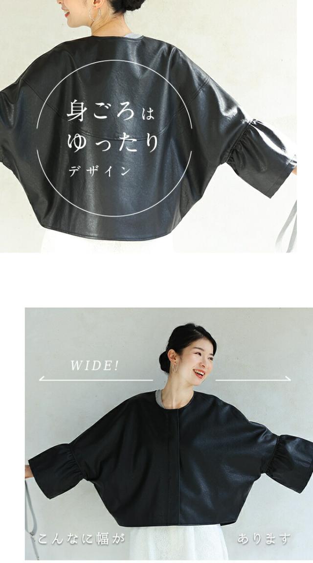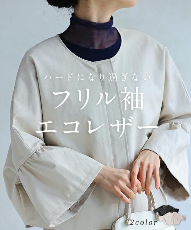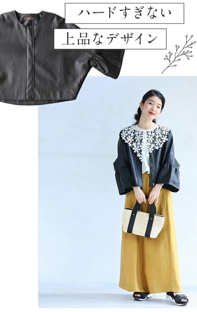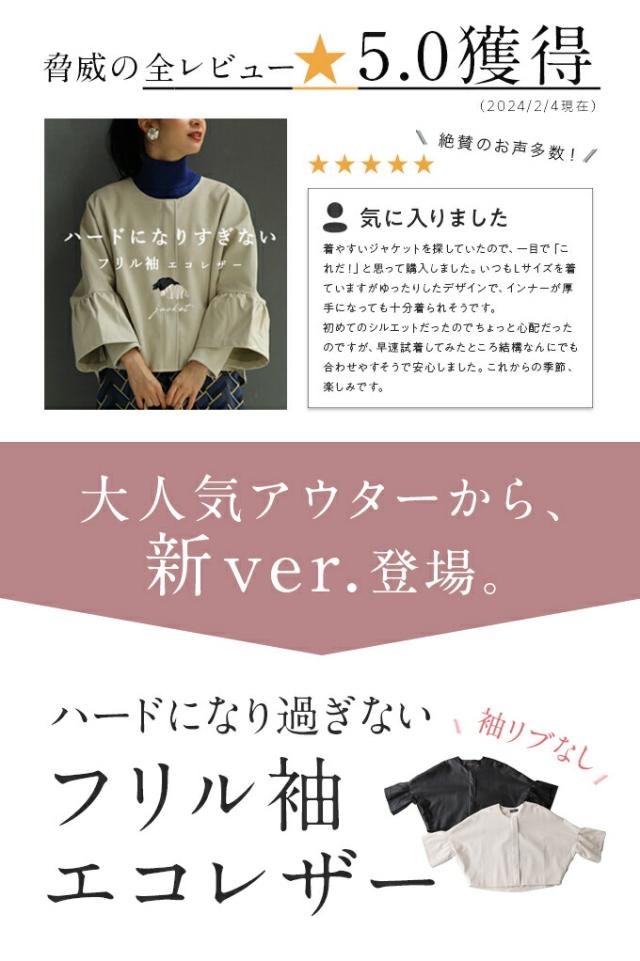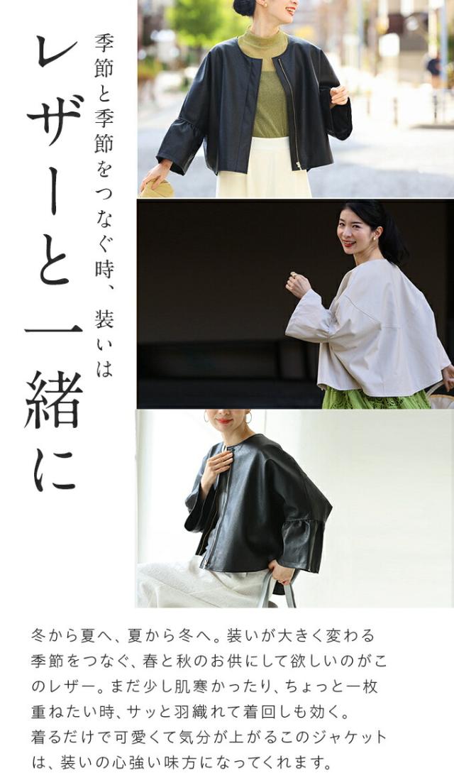 ハードになりすぎない フリル袖 エコレザー 軽アウター ジャケット cawaii fbk00041od S~3L対応 春服 春物 大人可愛い 上品 キレイめ 短め丈 体型カバー アイボリー ブラック レディース ファッション ミセス 30代 40代 50代