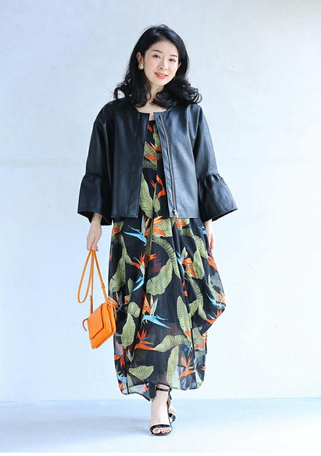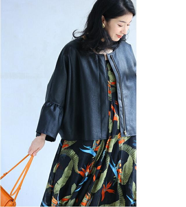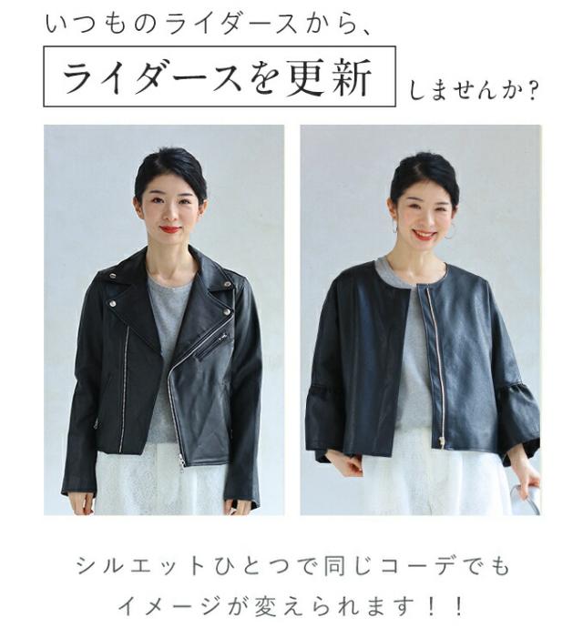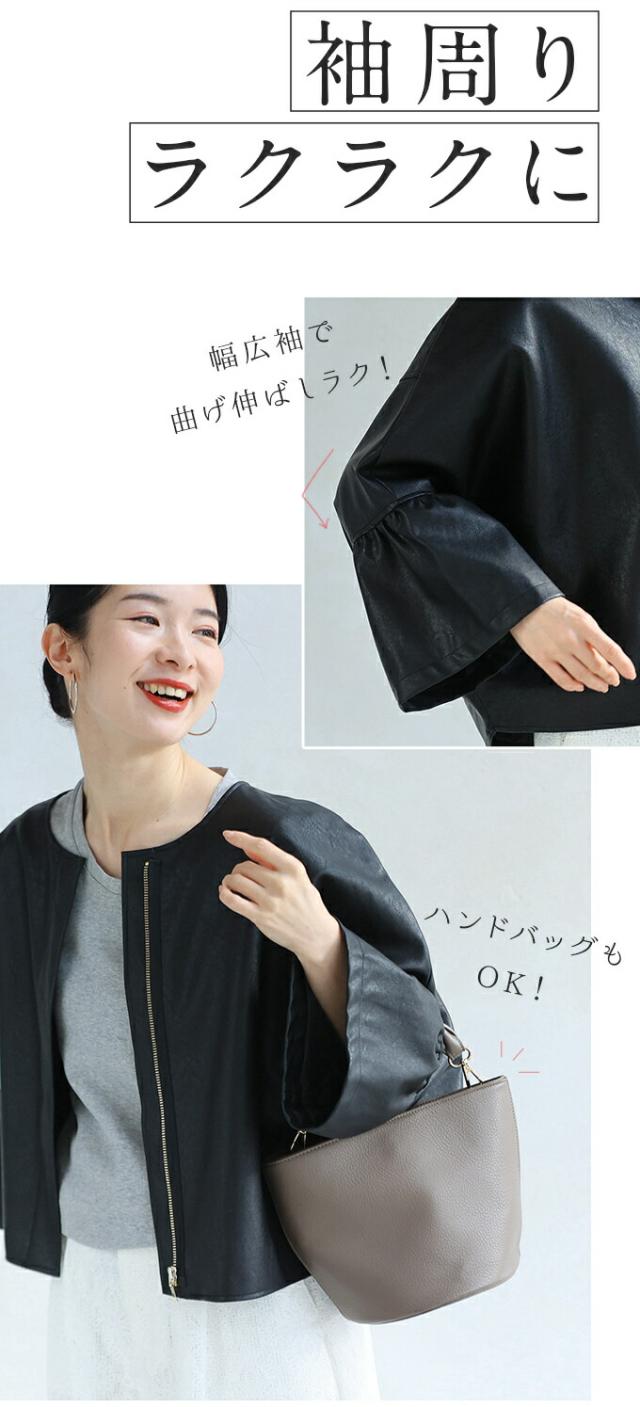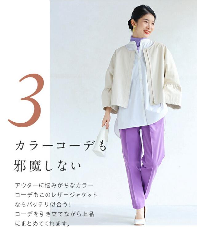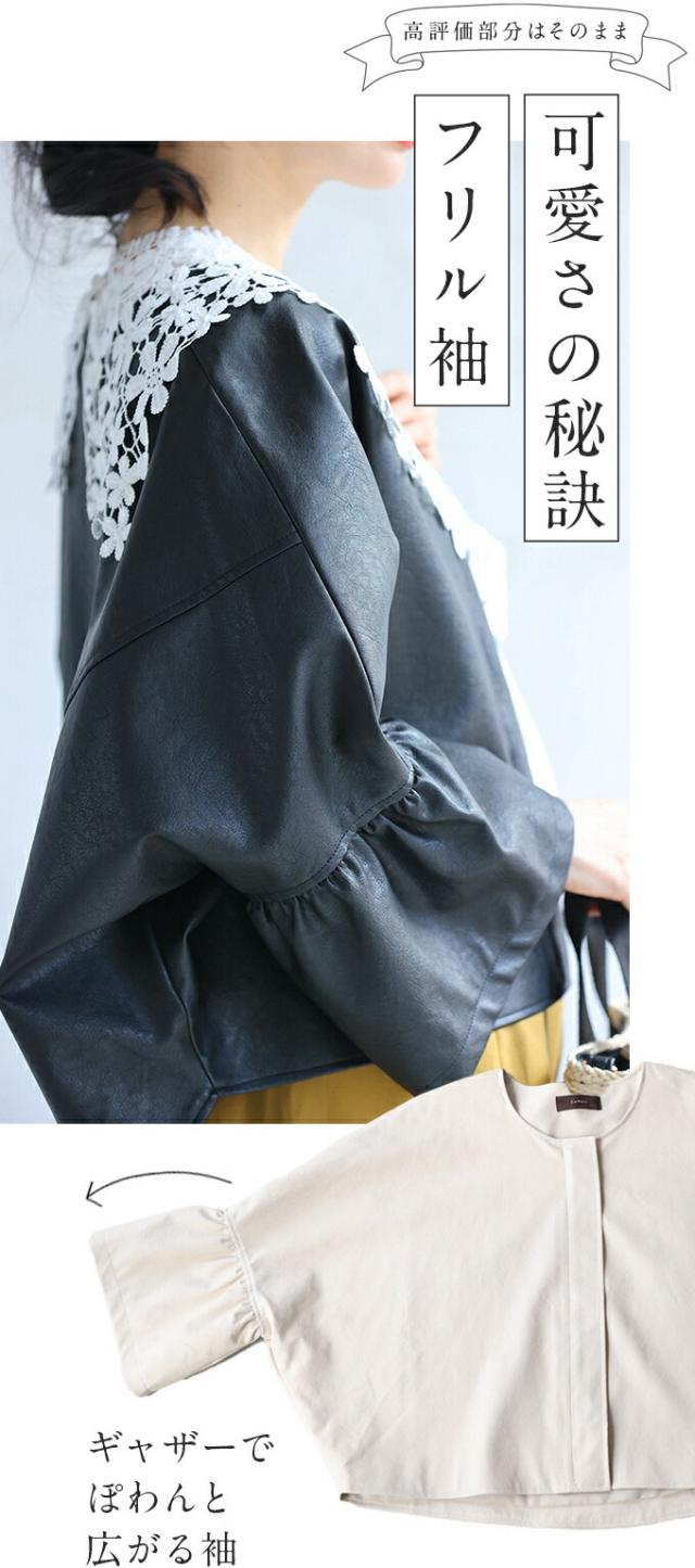 ハードになりすぎない フリル袖 エコレザー 軽アウター ジャケット cawaii fbk00041od S~3L対応 春服 春物 大人可愛い 上品 キレイめ 短め丈 体型カバー アイボリー ブラック レディース ファッション ミセス 30代 40代 50代