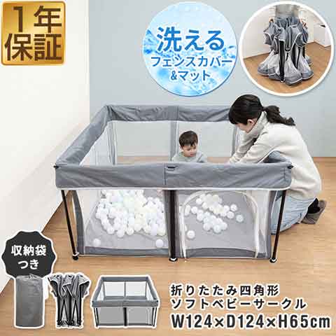 RiZKiZ ベビーサークル 折りたたみ メッシュ 正方形 124cm×124cm 約120cm マット付き コンパクト ハイタイプ ドア付き 洗えるカバー 安全 赤ちゃん お昼寝 柵 ファスナー扉 セーフティーグッズ 収納バッグ 対象年齢 0歳3か月〜 1年保証 送料無料