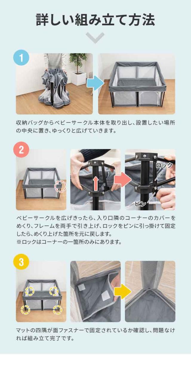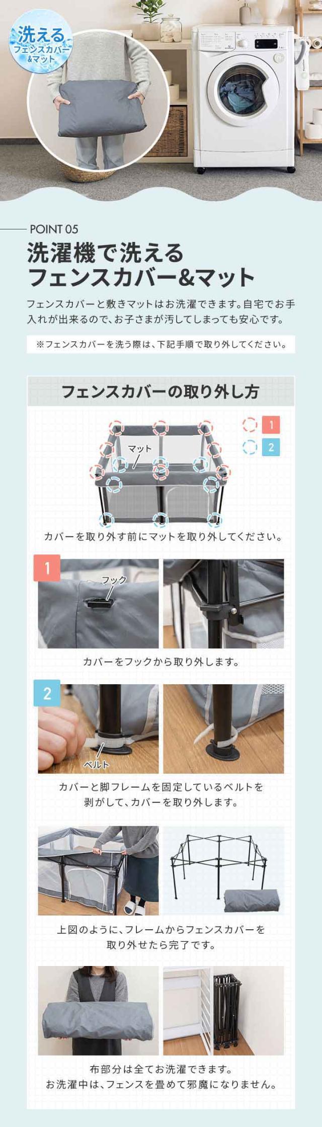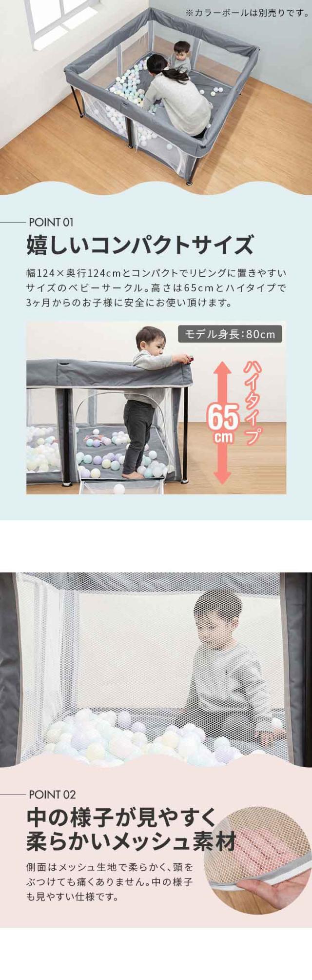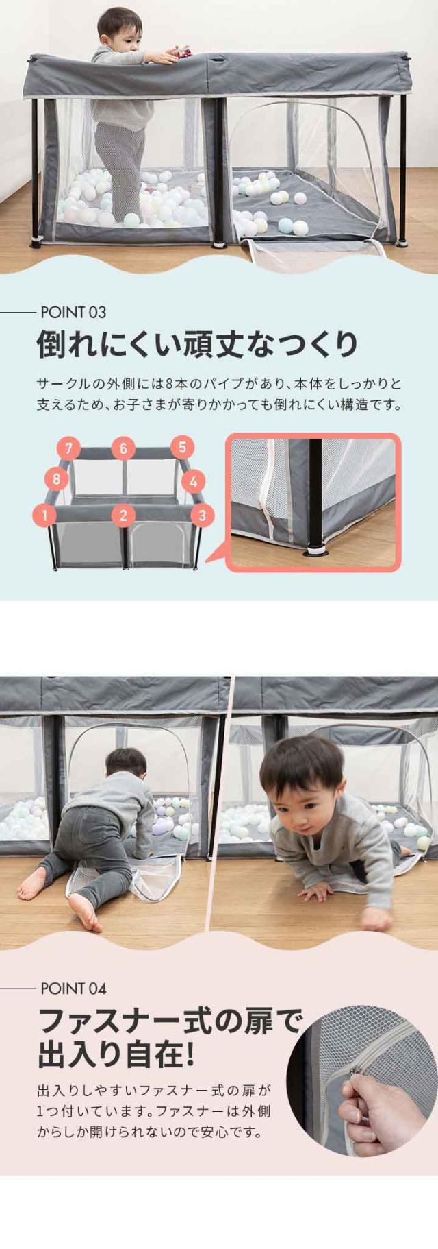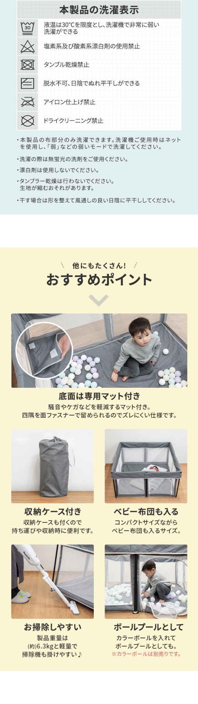 | 特記事項: ・ストーブやヒーターなど火気の近くで使用しないでください。火災ややけどの原因となります。 ・電源コードなど足をひっかけるおそれがあるものの近くで使用しないでください。 ・本製品内に、紐など首を締めてしまうおそれのあるもの、おもちゃなど誤って飲み込むおそれのあるものを入れないでください。 ・落下やけがの原因となりますので、本製品内にお子様が容易に登れる踏み台のようなものを置かないでください。 ・本製品に腰をかけたり、ぶら下がったり、揺らしたりしないでください。 ・使用するうちに連結部が緩んでくることがございます。安定的に点検し、緩み等があればメンテナンスしてください。万が一ひびや割れなど異常があった場合は使用を中止してください。 ・使用中はお子様から絶対に目を離さないでください。 ・お子様を本製品内で長時間横にしたり寝かせたりしないでください。 ・平坦かつ周囲に危険物のない安全な場所で使用してください。 ・勝手に改造したり、他メーカーの部品を代用しないでください。 ・万が一、破損・欠損などがあった場合は絶対に使用しないでください。 ・ベビーサークルを開閉するとき、可動部に指を挟まないように注意してください。 |