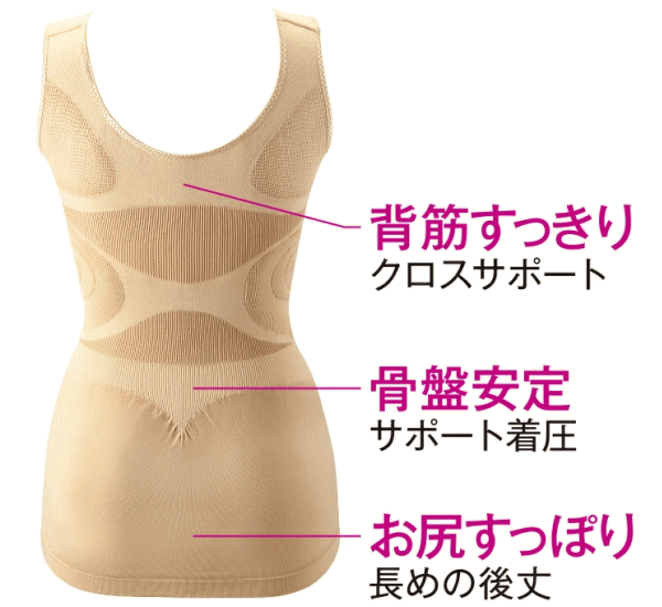 骨盤と姿勢を同時にサポートするインナーでするんとキレイ!着ている間、姿勢と骨盤をケアするソフトな着心地のサポートインナー。ブラジャー+キャミソール+補整下着がこれ一枚で。砂時計型シルエットが着用時の体のラインを滑らかに整えます。段差が出にくい脇高設計でシルエットスッキリ。全方向360°やさしく包み込んで苦しくない。後下がりのロング丈でお尻まですっぽり。伸縮性抜群、蒸れにくく吸水速乾性に優れた特殊繊維使用。■サイズ:M〜L、L〜LL■適応サイズM〜L(バスト)79〜94cm、L〜LL(バスト)86〜101cm■本体重量[M〜L]100g[L〜LL]115g■材質:ナイロン90%、ポリウレタン10%■カラー:ブラック、ベージュ、ライラック■生産国:日本製