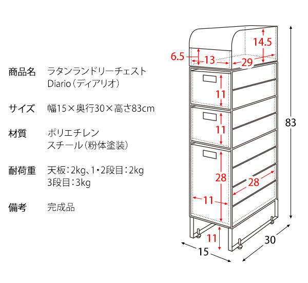 | 耐荷重 | 天板:2kg、1・2段目:2kg、3段目:3kg |