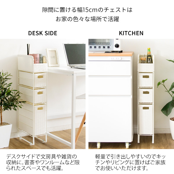 ランドリーチェスト 3段 完成品 スリム 薄型 幅15cm おしゃれ ラタン調 洗面所 すき間収納 ランドリーラック 防水パン またげる ランドリー収納 デッドスペース 収納 洗濯機 狭い 洗面所 収納 脱衣所 収納 棚 洗濯機横収納 省スペース 奥行30cm 高さ83cm 一人暮らし 隠す収納
