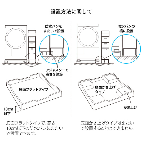 洗面所の隙間に置ける幅15cmのスリムサイズで、アジャスターを調整して防水パンをまたいでの設置も可能です。