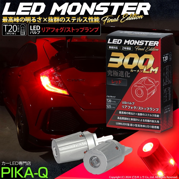 最高峰の明るさ×抜群のステルス性能 LED MONSTER 300lm リアフォグ/ストップランプ用LEDバルブ 明るさ:300lm 色:レッド バルブ規格:T20シングル[W21W] |