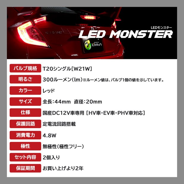 | 商品名 | LED MONSTER 300lm リアフォグ/ストップランプ用LEDバルブ 明るさ:300lm 色:レッド 規格:T20シングル[W21W] |