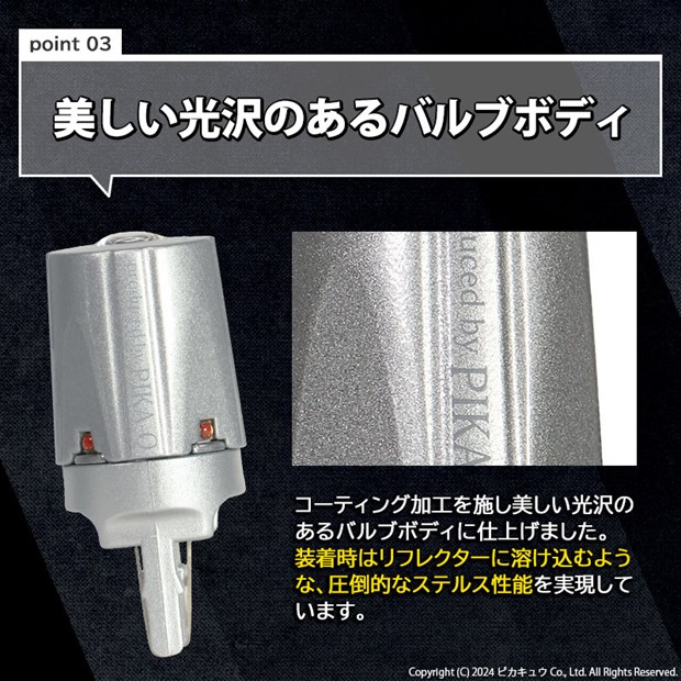 最高峰の明るさ300lm 全方向に美しく照射するストップランプ光。LEDの特性による瞬間点灯と圧倒的光量で、昼夜問わず後続車、周囲の人からの高い被視認性を実現しています。 LUMILEDS製 超高効率LED搭載 LED素子は2mm×2mmの極小サイズでハイスペックを誇るルミレッズ製超高効率LEDを5個搭載。バルブ1球で明るさ300ルーメンを実現しています。 被視認性を高める プロジェクターレンズ バルブトップは集光レンズを搭載し、照射光をより遠くへ放ち、4側面から放たれる照射光は効率よくリフレクターに反射し、全方向照射で死角の無い配光を生み出しています。 リフレクターに溶け込む 高ステルスバルブ (1)2mm×2mm極小サイズの超高効率LED搭載 バルブ装着時のステルス性を高めるため高出力で蛍光体が極力小さいLEDを選択。クリアレンズ車両への装着時にLED素子の映り込みを最小限に抑えることが出来ます。 (2)設計をミリ単位で突き詰め、LED基板を見せない工夫 ステルス性を高めるためにLEDを実装している基板部分ができるだけ目立たないように工夫を施しています。 設計寸法をミリ単位で調整修正しています。 (3)美しい光沢のあるバルブボディ コーティング加工を施し美しい光沢のあるバルブボディに仕上げました。装着時はリフレクターに溶け込むような圧倒的ステルス性能を実現しています。 (4)純正同等サイズ、全長44mm バルブサイズは純正とほぼ同等サイズなので装着車種を選びません。スタイリッシュなバルブデザインなのでリアフォグランプ・ストップランプランプ部をスマートに魅せることが出来ます。 大光量を支える 先進の放熱技術 (1)放熱効果が高いバルブ構造と高品質部材を使用 高い耐久性を保持し、LED性能を十分に引き出すため、放熱性能を徹底追及しています。 設計・部材をさらにブラッシュアップし長期間の使用に耐える高品質なバルブを仕上げました。 (2)オリジナル設計のアルミヒートシンク 完全オリジナルデザインの放熱効果を最大限に高めるアルミヒートシンク。その中でも熱伝導性に優れたA6063 アルミニウムを使用。バルブ全体を覆いLED及び基板から発生する熱を効率的に放熱します。 (3)放熱シリコングリス充填 LED基板とアルミヒートシンクの接触部分に放熱シリコングリスを充填。基板表面の微細な隙間を埋めることで熱伝導性を高め放熱効果を向上させます。 (4)定電流回路搭載 車両特性による突発的な過電流に影響されない安定した点灯を持続させる定電流回路を内蔵。DC12V国産車であればHV、PHV、EV等様々な車両に装着可能です。 |