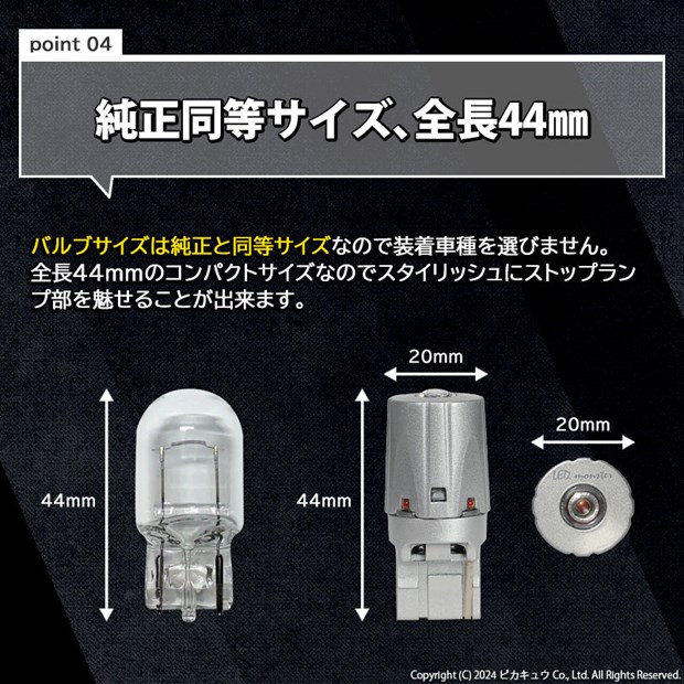 | サイズ | 全長:44mm/最大直径:20mm/ソケット幅:16mm ※純正T20白熱球サイズ 全長:44mm/最大直径:20mm/ソケット幅:16mm |