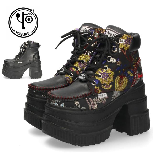 ブーツ レディース 厚底ブーツ ショート 黒 ヨースケ YOSUKE 靴 幅広 3E 編み上げブーツ 4460057 ブラック ブラックマルチ チャンキーヒール サイドジップ