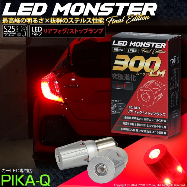 最高峰の明るさ×抜群のステルス性能 LED MONSTER 300lm リアフォグ/ストップランプ用LEDバルブ 明るさ:300lm 色:レッド バルブ規格:S25シングル[BA15s] |