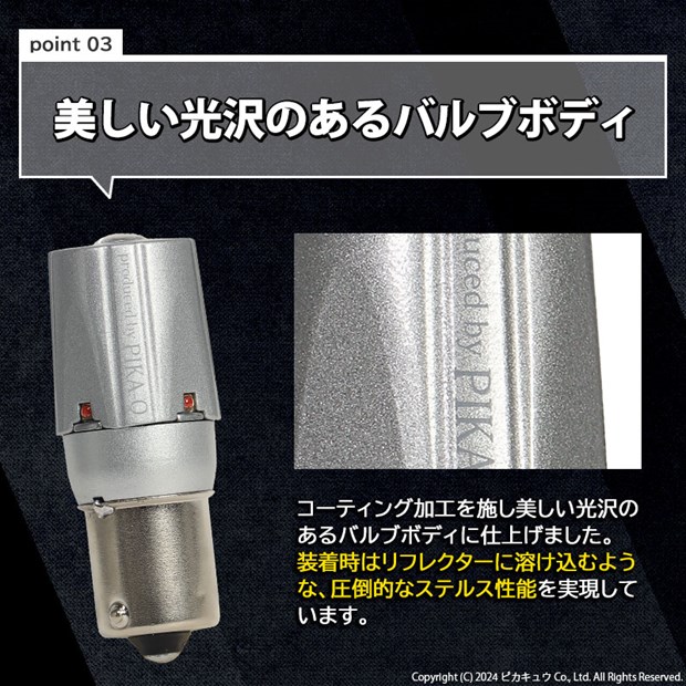最高峰の明るさ300lm 全方向に美しく照射するストップランプ光。LEDの特性による瞬間点灯と圧倒的光量で、昼夜問わず後続車、周囲の人からの高い被視認性を実現しています。 LUMILEDS製 超高効率LED搭載 LED素子は2mm×2mmの極小サイズでハイスペックを誇るルミレッズ製超高効率LEDを5個搭載。バルブ1球で明るさ300ルーメンを実現しています。 被視認性を高める プロジェクターレンズ バルブトップは集光レンズを搭載し、照射光をより遠くへ放ち、4側面から放たれる照射光は効率よくリフレクターに反射し、全方向照射で死角の無い配光を生み出しています。 リフレクターに溶け込む 高ステルスバルブ (1)2mm×2mm極小サイズの超高効率LED搭載 バルブ装着時のステルス性を高めるため高出力で蛍光体が極力小さいLEDを選択。クリアレンズ車両への装着時にLED素子の映り込みを最小限に抑えることが出来ます。 (2)設計をミリ単位で突き詰め、LED基板を見せない工夫 ステルス性を高めるためにLEDを実装している基板部分ができるだけ目立たないように工夫を施しています。 設計寸法をミリ単位で調整修正しています。 (3)美しい光沢のあるバルブボディ コーティング加工を施し美しい光沢のあるバルブボディに仕上げました。装着時はリフレクターに溶け込むような圧倒的ステルス性能を実現しています。 (4)純正同等サイズ、全長53mm バルブサイズはS25純正球とほぼ同等サイズなので装着車種を選びません。スタイリッシュなバルブデザインなので、リアフォグランプ・ストップランプ部をスマートに魅せることが出来ます。 大光量を支える 先進の放熱技術 (1)放熱効果が高いバルブ構造と高品質部材を使用 高い耐久性を保持し、LED性能を十分に引き出すため、放熱性能を徹底追及しています。 設計・部材をさらにブラッシュアップし長期間の使用に耐える高品質なバルブを仕上げました。 (2)オリジナル設計のアルミヒートシンク 完全オリジナルデザインの放熱効果を最大限に高めるアルミヒートシンク。その中でも熱伝導性に優れたA6063 アルミニウムを使用。バルブ全体を覆いLED及び基板から発生する熱を効率的に放熱します。 (3)放熱シリコングリス充填 LED基板とアルミヒートシンクの接触部分に放熱シリコングリスを充填。基板表面の微細な隙間を埋めることで熱伝導性を高め放熱効果を向上させます。 (4)定電流回路搭載 車両特性による突発的な過電流に影響されない安定した点灯を持続させる定電流回路を内蔵。DC12V国産車であればHV、PHV、EV等様々な車両に装着可能です。 |