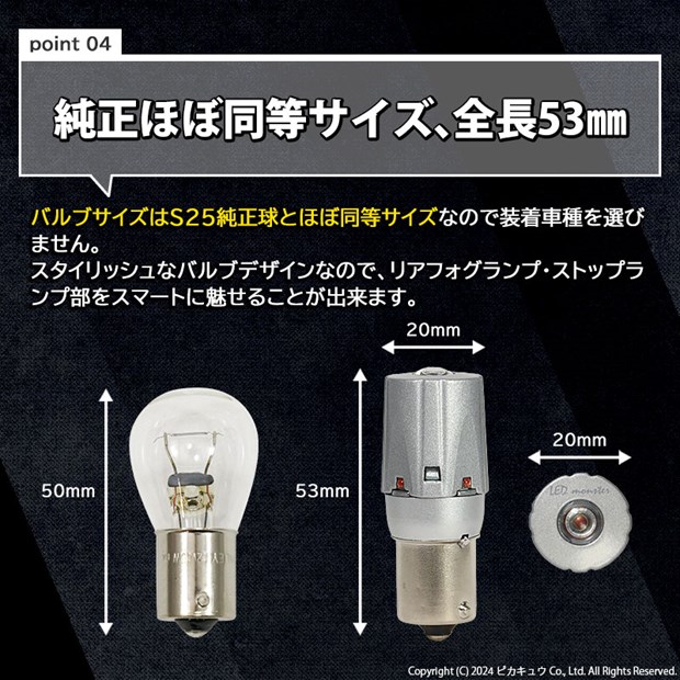 | サイズ | 全長:53mm/最大直径:20mm/ソケット幅:15mm ※純正S25白熱球サイズ 全長:50mm/最大直径:26mm/口金幅:15mm |