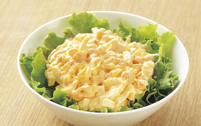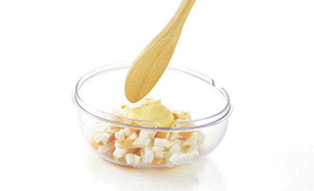 ゆでたまごを素早くマッシュ!たまごサラダがあっというまに完成します。