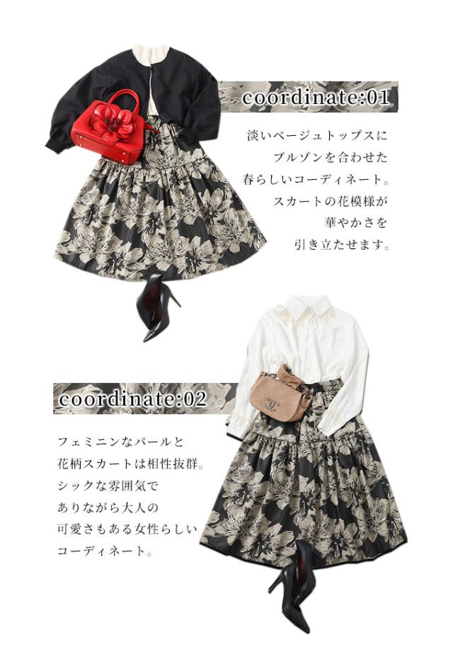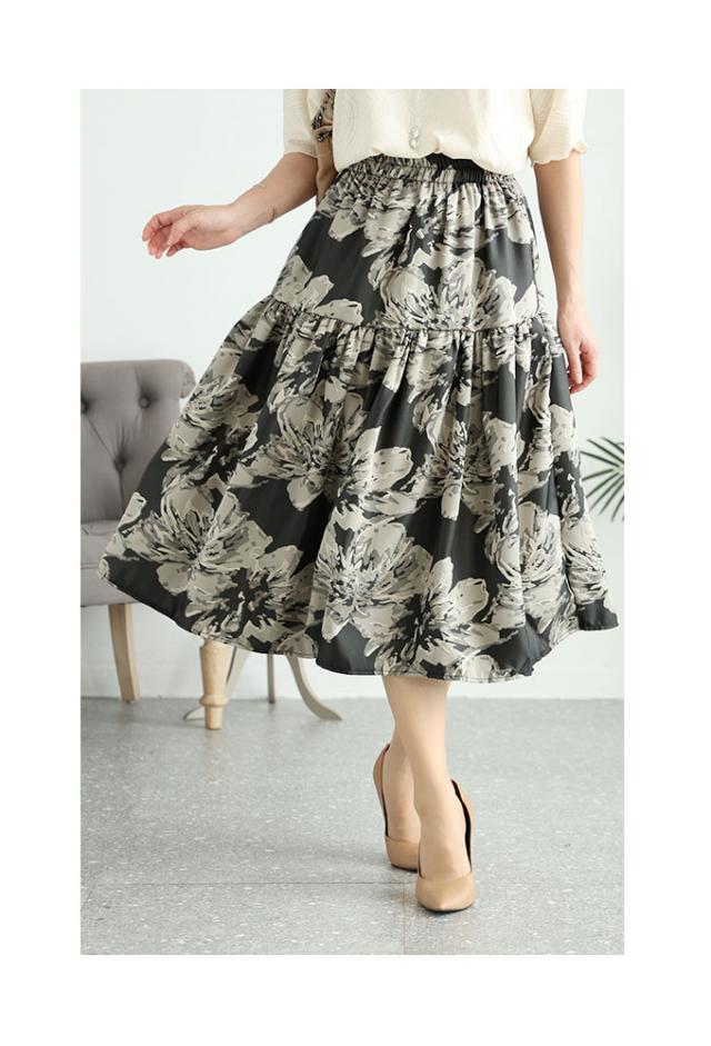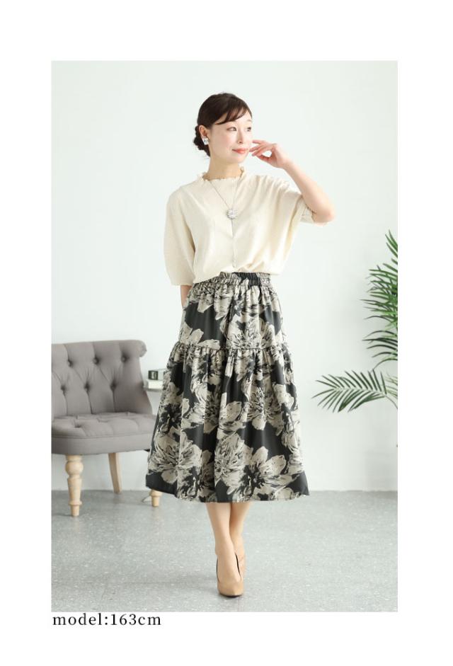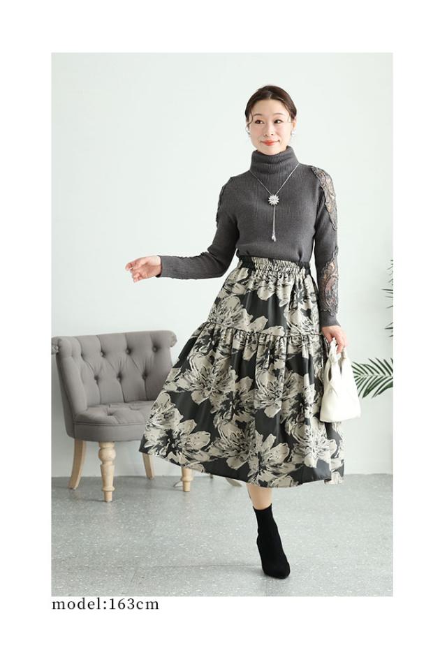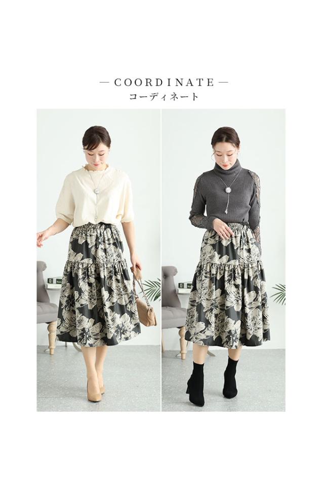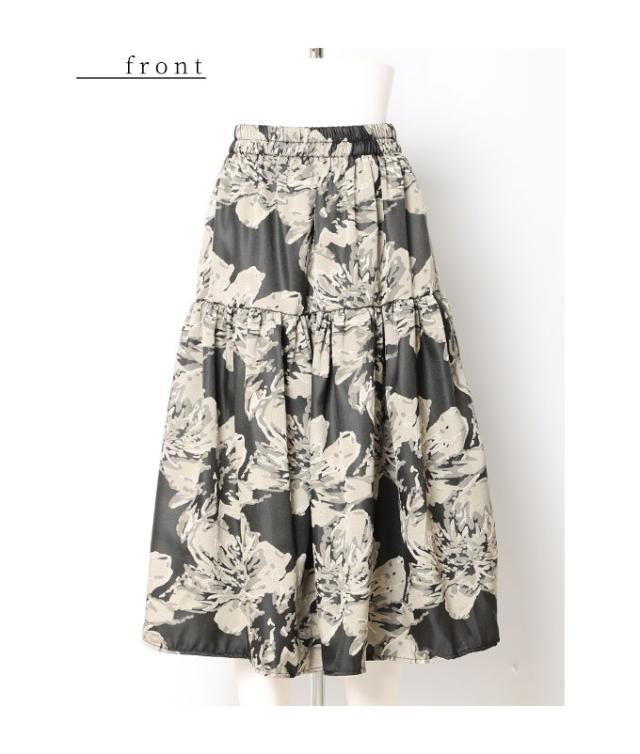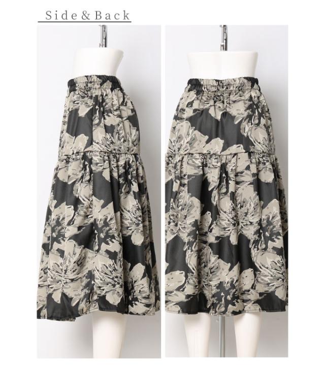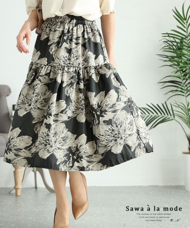 春新作 アートな花模様を描いたティアードミディアムスカート レディース ファッション ボトムス スカート 黒 ブラック 花柄 冬 大人可愛い 40代 レディースファッション 50代女性 ファッション 60代 ミセスファッション サワアラモード sawaalamode otona mode-9320