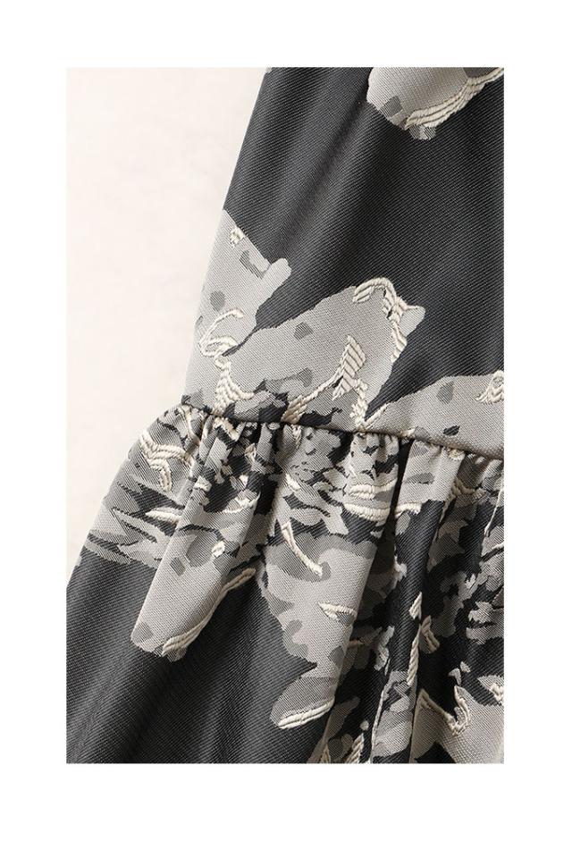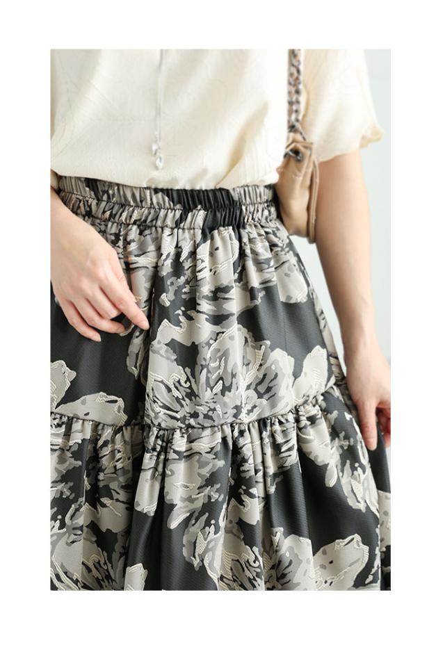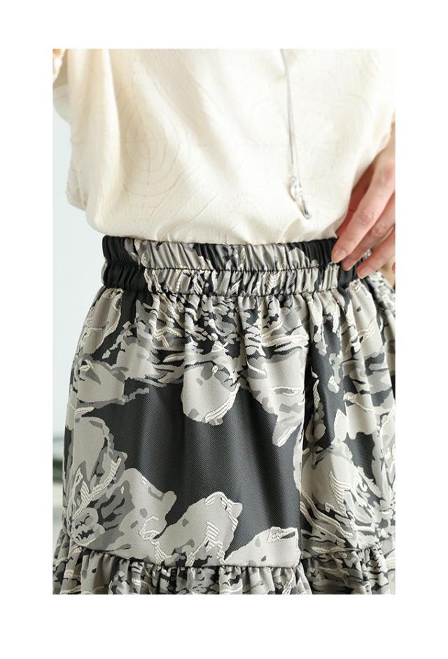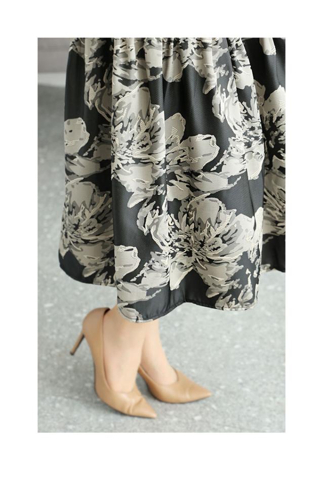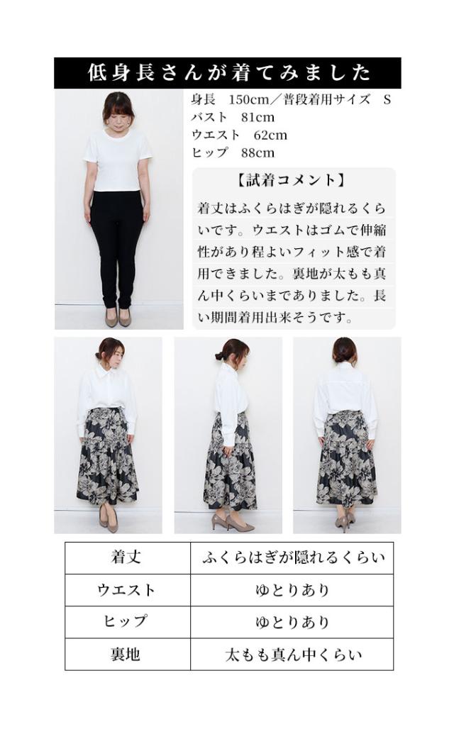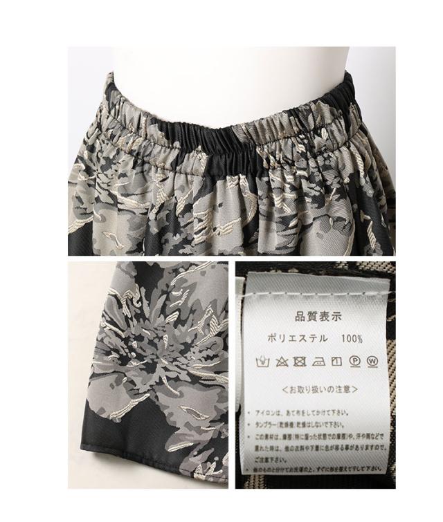 スカート丈はふくらはぎ丈、ウエストは総ゴム入りで楽に穿けました。大輪の花柄が印象的なジャガード生地で、程よく光沢感があり上品です。脚の付け根くらいの位置からギャザー切り替えが入り、ふんわりキレイなシルエットでした。膝上丈の裏地付きです。
