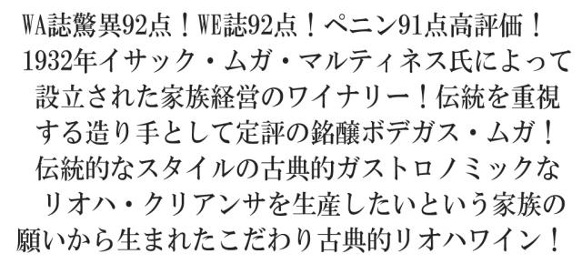 ボデガス・ムガは1932年にイサック・ムガ・マルティネスによって設立された家族経営のワイナリーです。リオハのワイン産地の中心部、バリオ・デ・ラ・スタシオンに位置し、現在は3代目が伝統を受け継いでいます。畑はリオハ・アルタにあり、細心の注意を払ってブドウ栽培を行っています。手摘みで収穫したブドウは厳しく選果をした後、除梗をします。 ムガでは伝統的な手法を貫き、発酵から熟成まで全て樽を使用しており、発酵用のセラーには90個の木樽の発酵槽が設置されています。 スペインでは珍しく、3人の樽職人を雇い、品種やワインのタイプに合わせで全て手作業で樽を作っています。澱引きは全て重力に沿っておこない、清澄には卵白を使用します。伝統を重視することがワインそのものを重視することでもあると考えています。 手摘みで収穫したブドウは厳しく選果をした後、除梗をします。ムガでは伝統的な手法を貫き、発酵から熟成まで全て樽を使用しており、スペインでは珍しく、4人の樽職人を雇い、品種やワインのタイプに合わせて全て手作業で樽を作っています。澱引きは全て重力に沿っておこない、清澄には卵白を使用します。伝統を重視しながらワイン造りをすることを重要であると考えてます。 | ![]() ■ぶどう品種:テンプラニーリョ70%、ガルナッチャ30% ■発酵・熟成:フレンチオークとセントラルヨーロピアンオーク樽で14ヶ月熟成 ■樹齢:テンプラニーリョは2010年植樹、ガルナッチャは1990年植樹 スペイン辛口フルボディ赤ワイン愛好家大注目!スペイン高級ワインの代名詞!リオハ! 伝統を重んじながらも新しい挑戦を続けるこの家族経営のワイナリーは、1932年にイサック・ムガ・マルティネスによって設立され、現在は3代目がオーナーを務める。 テンプラニーリョとガルナッチャのブレンドにより、フローラルでジューシー、表情豊かで親しみやすい味わいを実現している。特にガルナッチャはこのワインのポートフォリオ中で割合が高く、その個性が強く反映されている。14ヶ月の熟成期間を経て、深みと凝縮した豊かな香り、そして長いエレガントな余韻を持つ究極のフルボディ辛口赤ワインが完成した。 パーカーポイント92点、ワインエンスージアスト誌でも92点と高評価を受け、リオハワインの新たな可能性を示している。 |