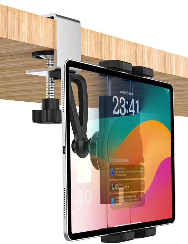 【ユニバーサルタブレットホルダー】キッチン、卓上、デスク、オフィス、寝室、ゴルフカート、フォークリフト、ガレージ、物置など、さまざまな場所で使用できます。調整可能な金属製クランプは、最大1.6インチ(40mm)までの厚さのキャビネット、棚、テーブルにしっかりと固定できます。