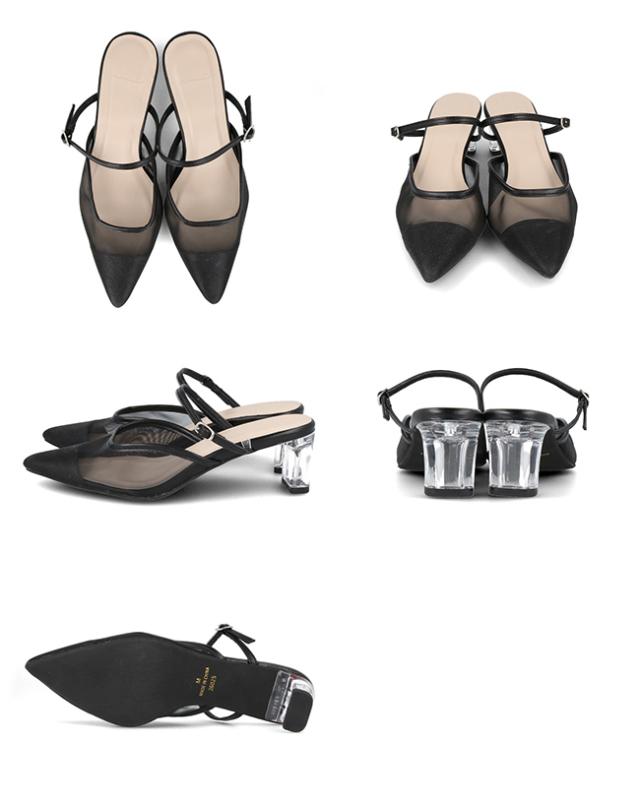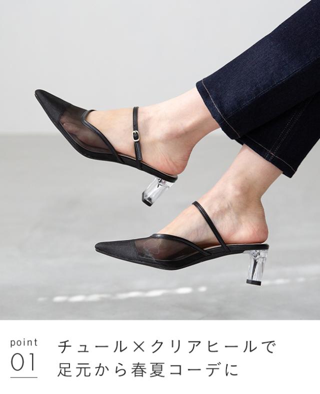今季もまだまだトレンド感あるチュール生地と、つやのあるクリアヒールが春夏にぴったり。