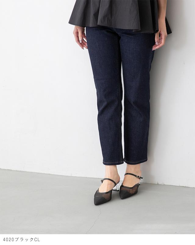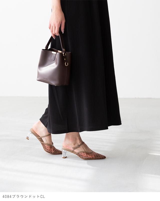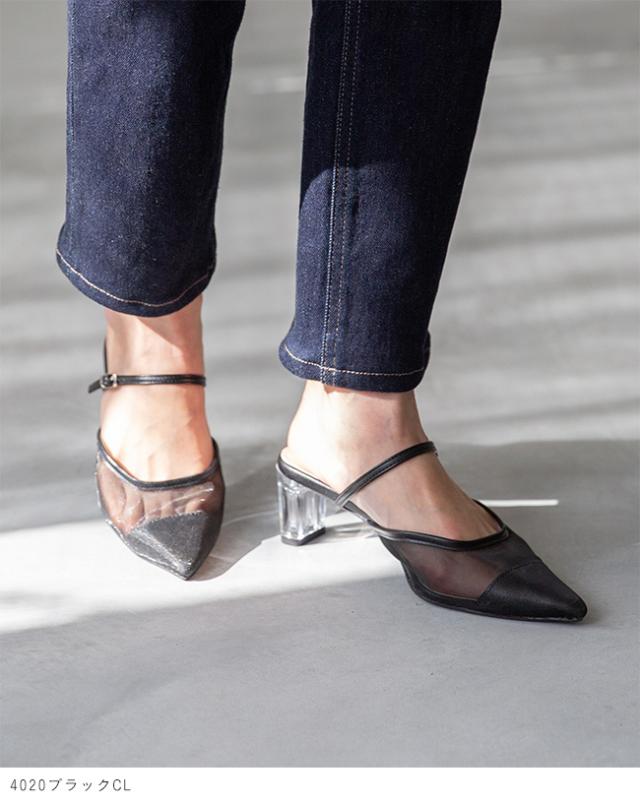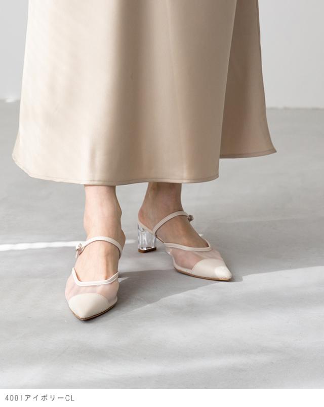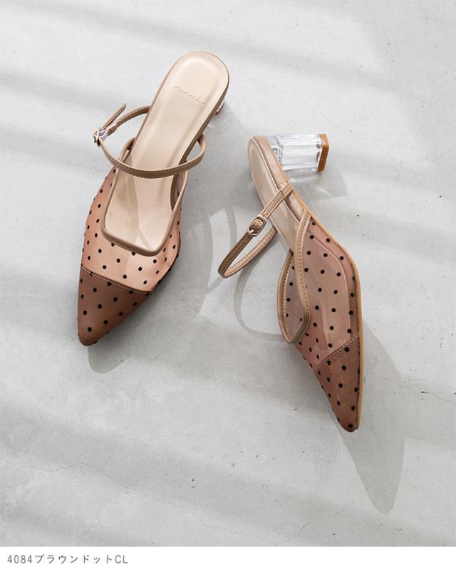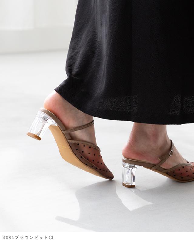 ミュール サンダル パンプス かかとなし レディース クリアヒール 痛くない ポインテッドトゥ チュール ドット TS 送料無料