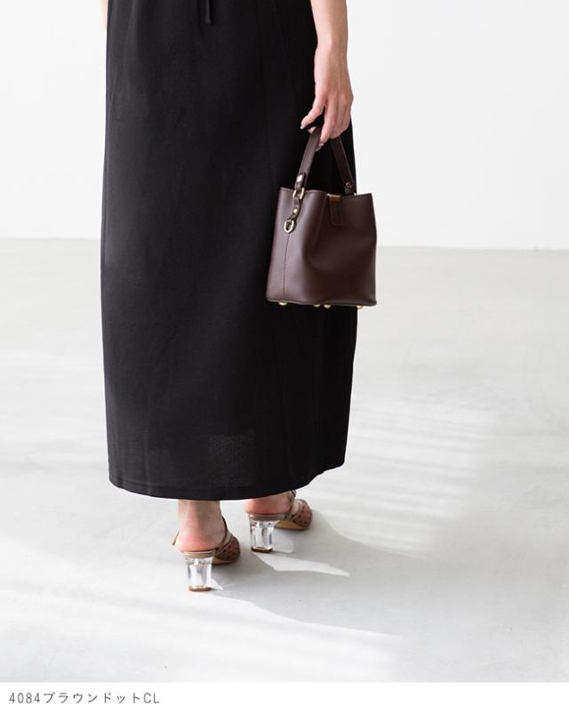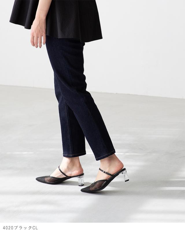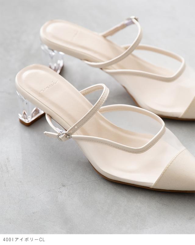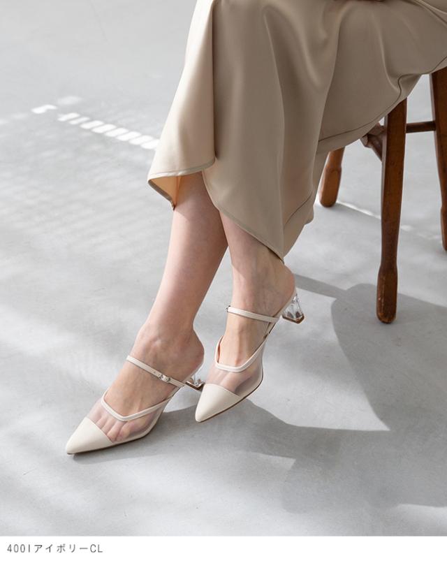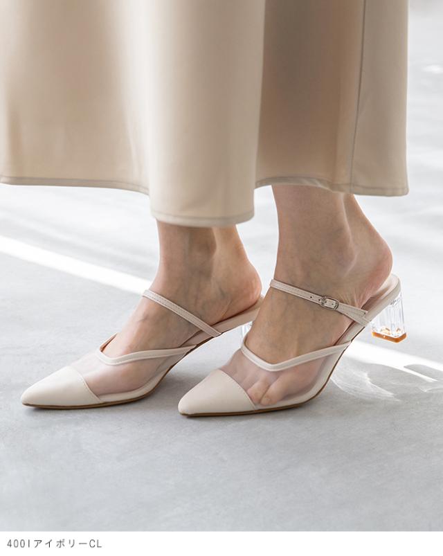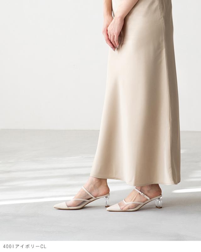 アッパーにもヒールにもクリア素材を使った、足元から春夏を感じさせるミュール。