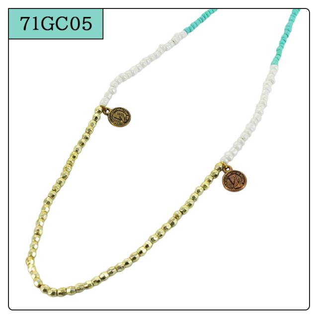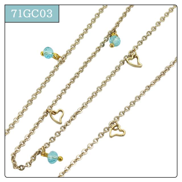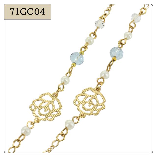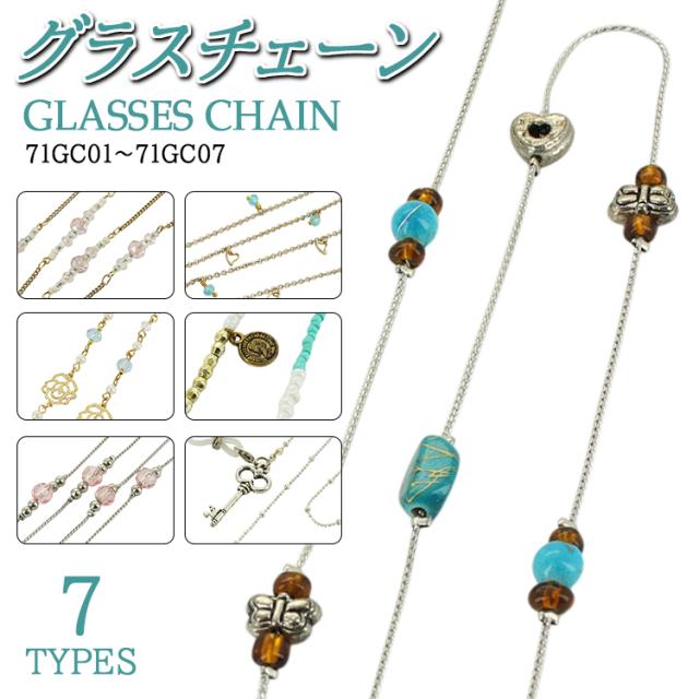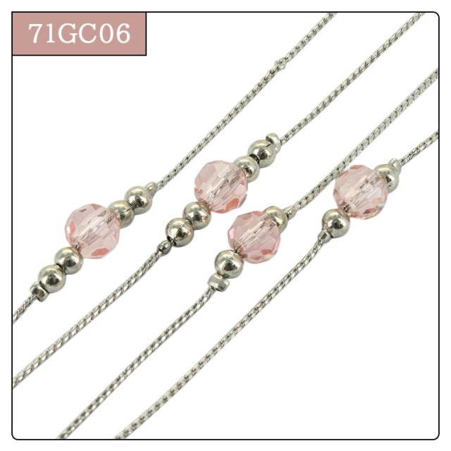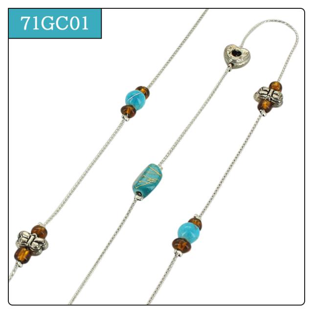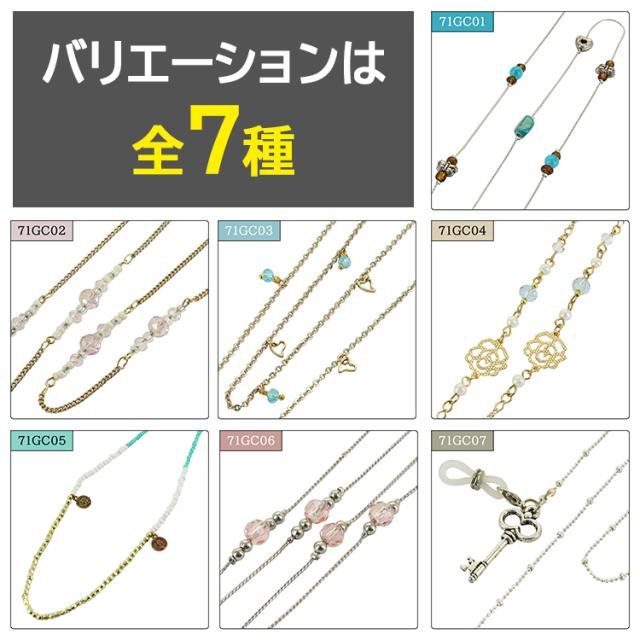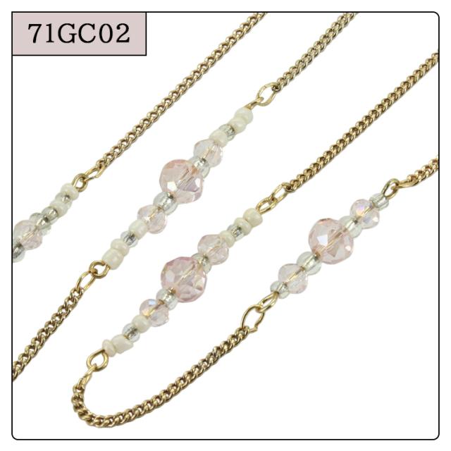 | < 種類> 71GC01 シルバー/ターコイズ 71GC02 ゴールド/ピンク 71GC03 ゴールド/ブルー 71GC04 ゴールド/パープル 71GC05 ゴールド/ターコイズ 71GC06 シルバー/ピンク 71GC07 シルバー | <素材> 71GC01 、02、03、04、06:銅、プラスチック 71GC05:銅/ガラス 71GC07:銅 <全長> 750mm |