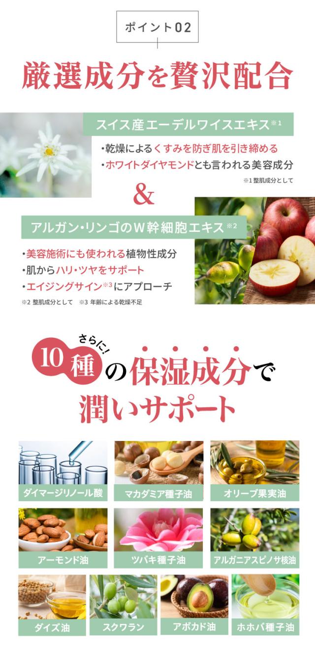 | 成分 | ダイズ油、トリエチルヘキサノイン、エチルヘキサン酸セチル、トリイソステアリン酸PEG-20グリセリル、マカデミア種子油、イソステアリン酸PEG-10BG 、ジイソステアリン酸PEG-8、ダイマージリノール酸(フィトステリル/イソステアリル/セチル/ステアリル/ベヘニル)、 香料、トコフェロール、イソステアリン酸ポリグリセリル-2、アルガニアスピノサ核油、ツバキ種子油、アーモンド油、アボカド油、水、BG、イソマルト、グリセリン、ベヘニルアルコール、ペンタステアリン酸ポリグリセリル-10、ステアロイルラクチレートNa、セラミドNP、リンゴ果実培養細胞エキス、エーデルワイス花/葉エキス、カニナバラ果実エキス、フェノキシエタノール、レシチン、キサンタンガム、ラベンダー花エキス、ヒメフウロエキス、アルガニアスピノサカルス培養エキス、ノウゼンハレン花エキス、クエン酸、パルミチン酸アスコルビン、アスコルビン酸 |
