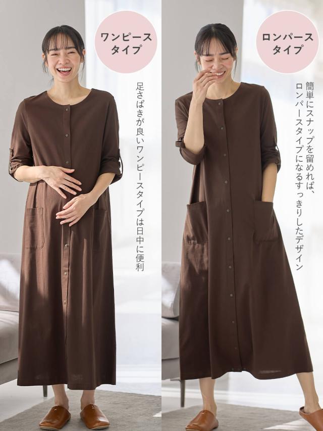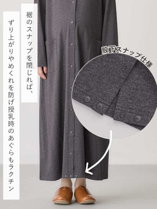・裾のスナップボタンでロンパースデザインにもなり、産後はあぐらでベビーを支えながら授乳するのに便利